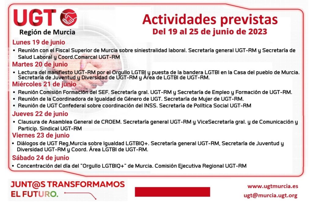 Actividades previstas de la Comisión Ejecutiva Regional de UGT-RM, del 19 al 25 de junio 2023