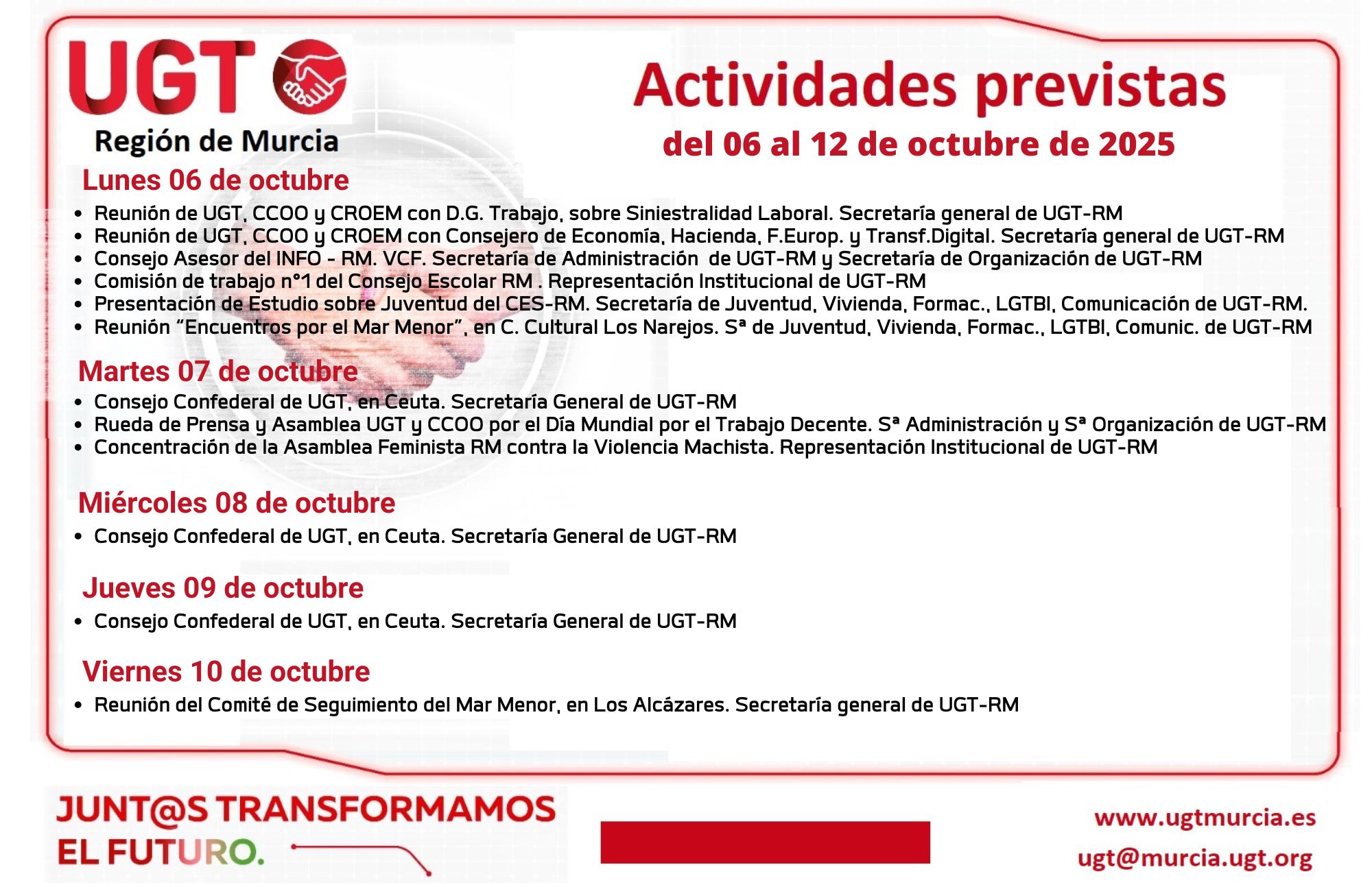 Actividades previstas de la Comisión Ejecutiva Regional de UGT-RM. Semana del 06 al 12 de octubre de 2025