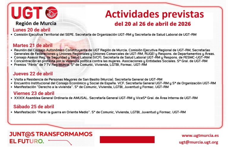 Actividades previstas por la Ejecutiva Regional de UGT, semana del 13 al 19 de abril de 2026