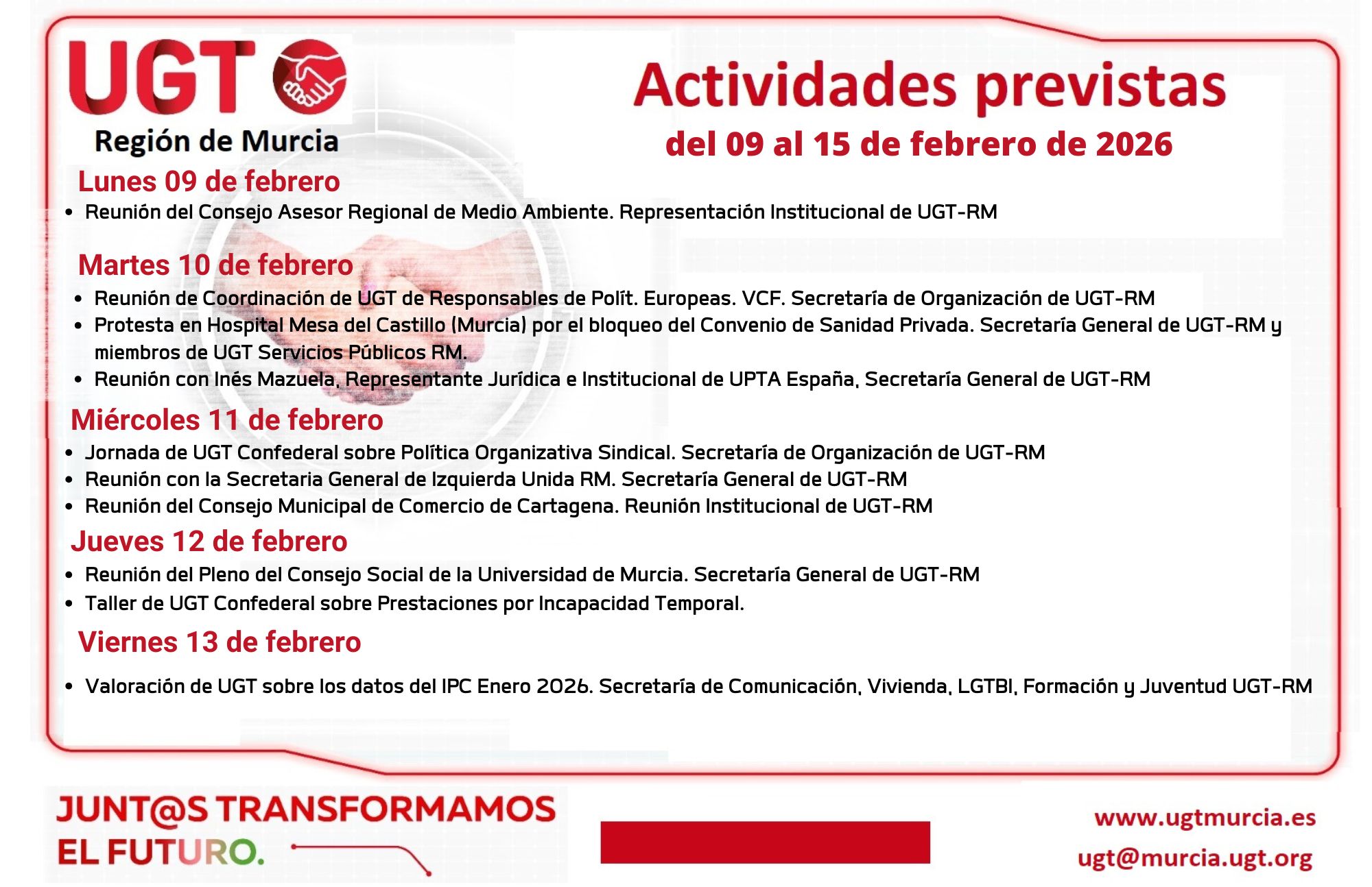Previsiones Informativas de la Comisión Ejecutiva Regional de UGT-RM, semana del 09 al 15 de febrero de 2026