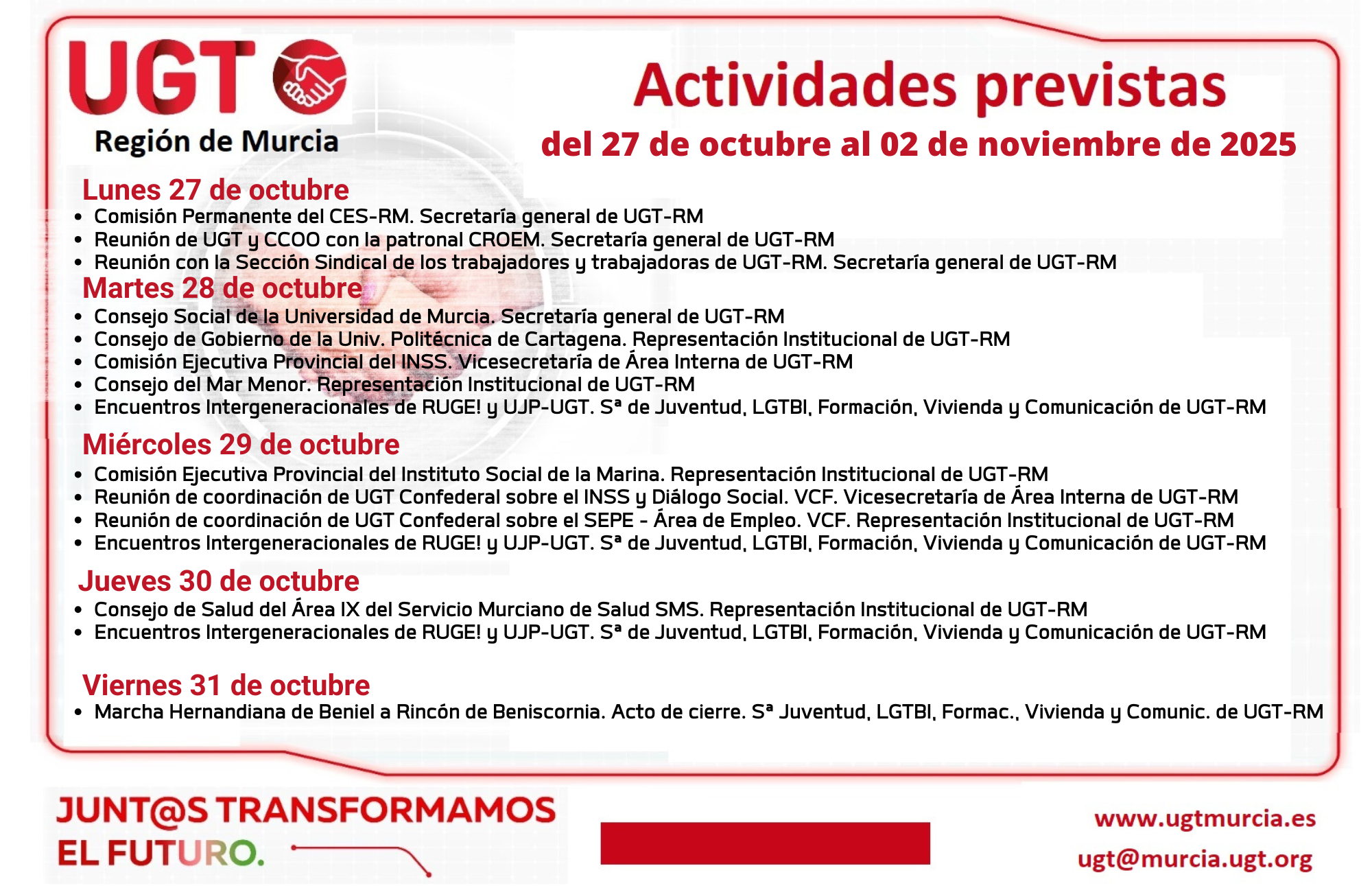 Previsiones informativas de la Comisión Ejecutiva Regional de UGT-RM – Semana del 27 de octubre al 02 de noviembre 2025