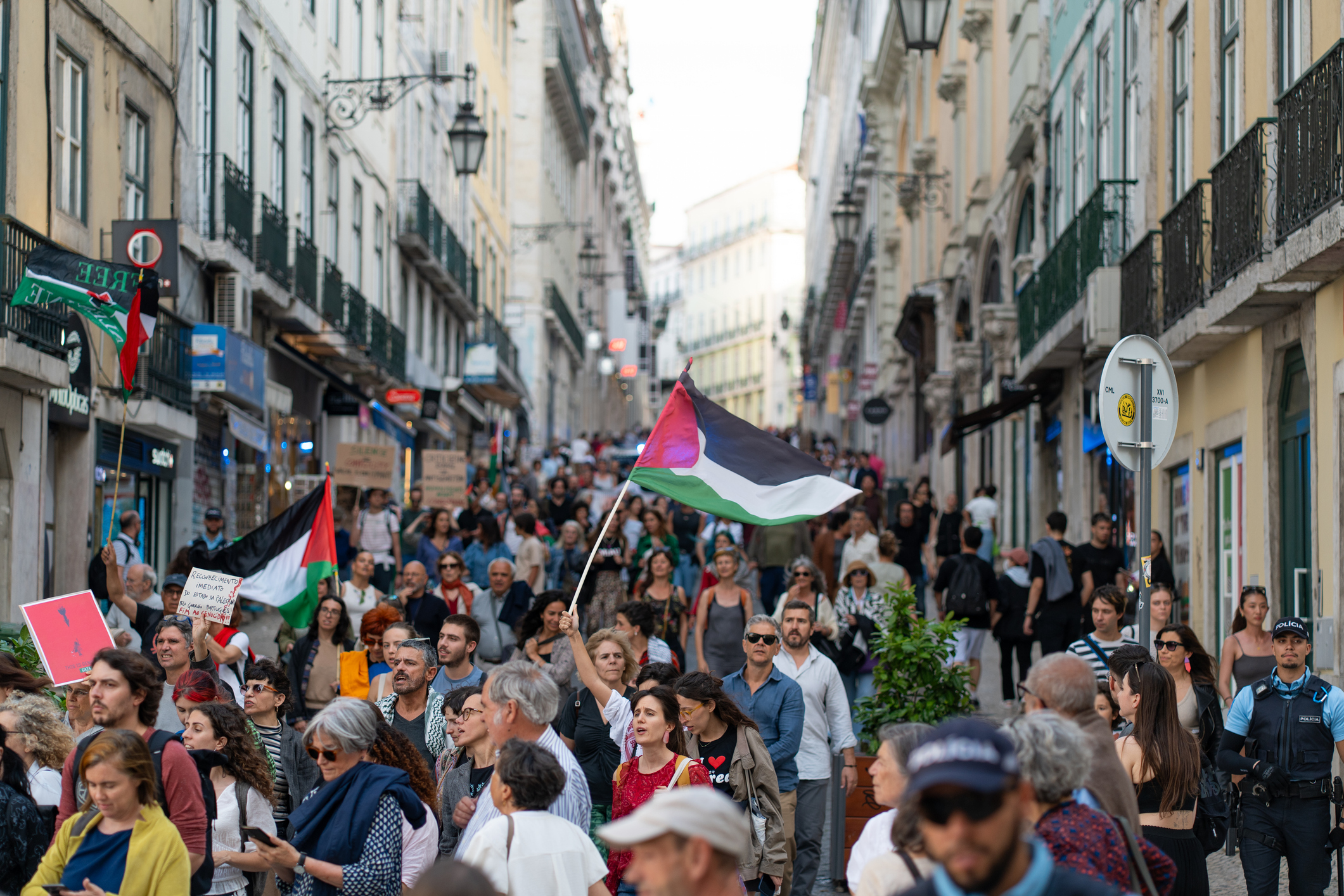 Lisbon, Portugal 17 June 2025 Crowds gather in a vibrant urban area, waving Palestinian flags and holding signs advocating for Palestinian rights.